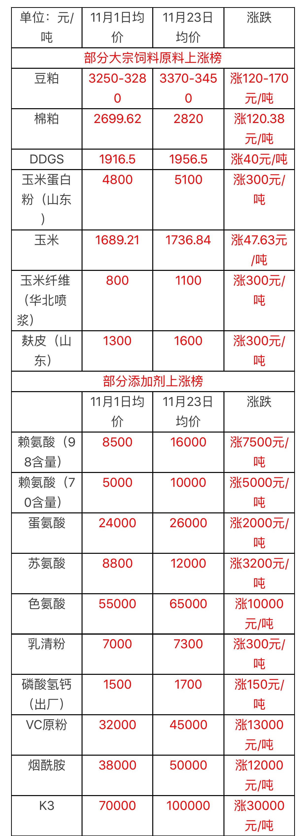 13381196289当最严治超遇最强寒潮和最严环保,还有上游原料挺价、人民币大贬等因素伴随,这个冬天最疯狂,冬季是煤炭运输高峰期以及东北玉米上量期,此季节 921治超新规的执行就像是冬天里的一把火,带来光和热的同时也点燃多个原料的导火线,业内多受运力紧张运费上涨的困扰,加上其他利好因素火上浇油,多个饲料原料手拉手齐上涨,11月份疯狂加剧,对此饲料巴巴小编根据慧通数据统计整理(参见下图),以便来感受这个疯狂之冬!