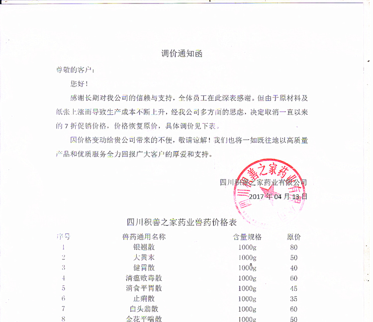 【通知】四川积善之家调价通知