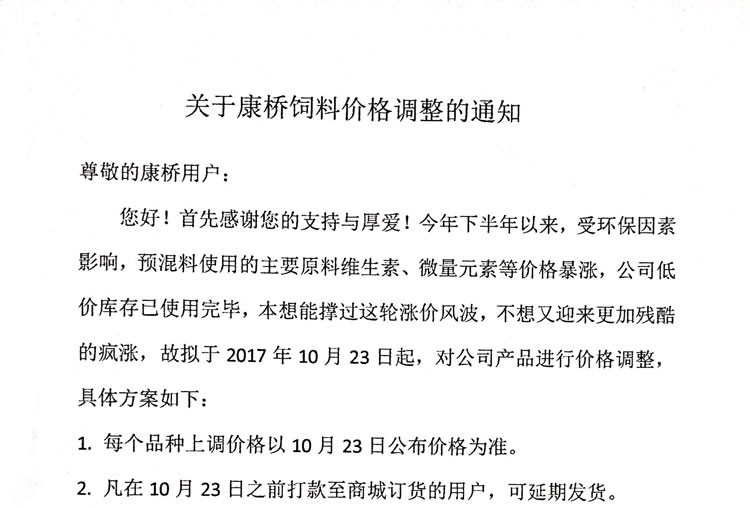 【调价公告】关于康桥饲料调价的提前公告