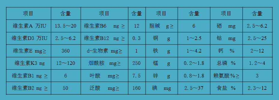 磷酸氢钙、石粉、食盐、赖氨酸、氯化胆碱、维生素A、维生素D3、维生素E、维生素K3、维生素B1、维生素B2、维生素B6、维生素B12、d-生物素、叶酸、烟酰胺、D-泛酸钙、硫酸铜、硫酸亚铁、硫酸锰、硫酸锌、碘酸钙、亚硒酸钠、氯化钴、植酸酶、优质面粉、巧克力粉、进口鱼粉(载体)等。