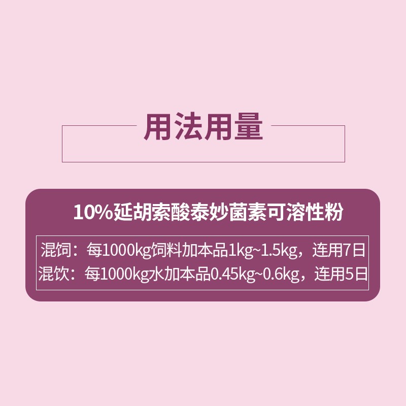 商品名称:【哼哼动保】10%延胡索酸泰妙菌素可溶性粉 2KG/盒 支原体肺炎、胸膜肺炎、回肠炎,可饮水 商品编号:ZHUEJPH010053 品牌:哼哼动保 上架时间:2020-09-14 商品净重:1.000千克 产品批文号:兽药字170202601