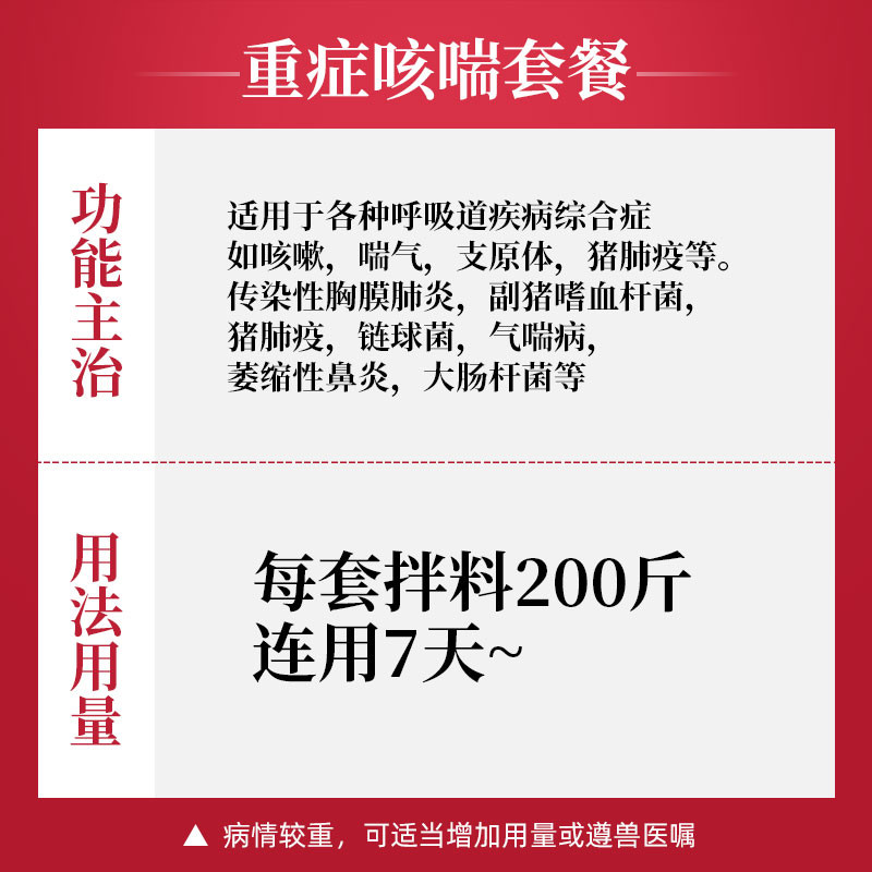 - 商品名称:【吉博士】重症咳喘统治套餐呼吸道套餐氟苯尼考多西环素泰万菌素甘草颗粒止咳平喘猪肺疫提高免疫力