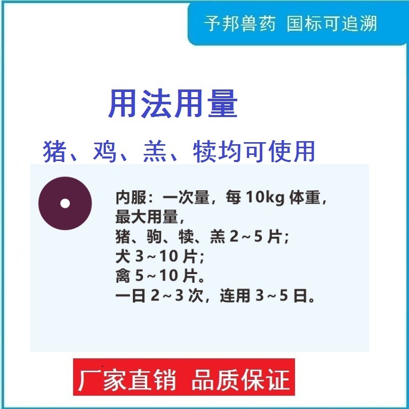 - 使用方法:内服:一次量,每 10kg 体重,猪、驹、犊、羔 2~5 片;犬 3~10 片; 禽 5~10 片。一日 2~3 次,连用 3~5 日。