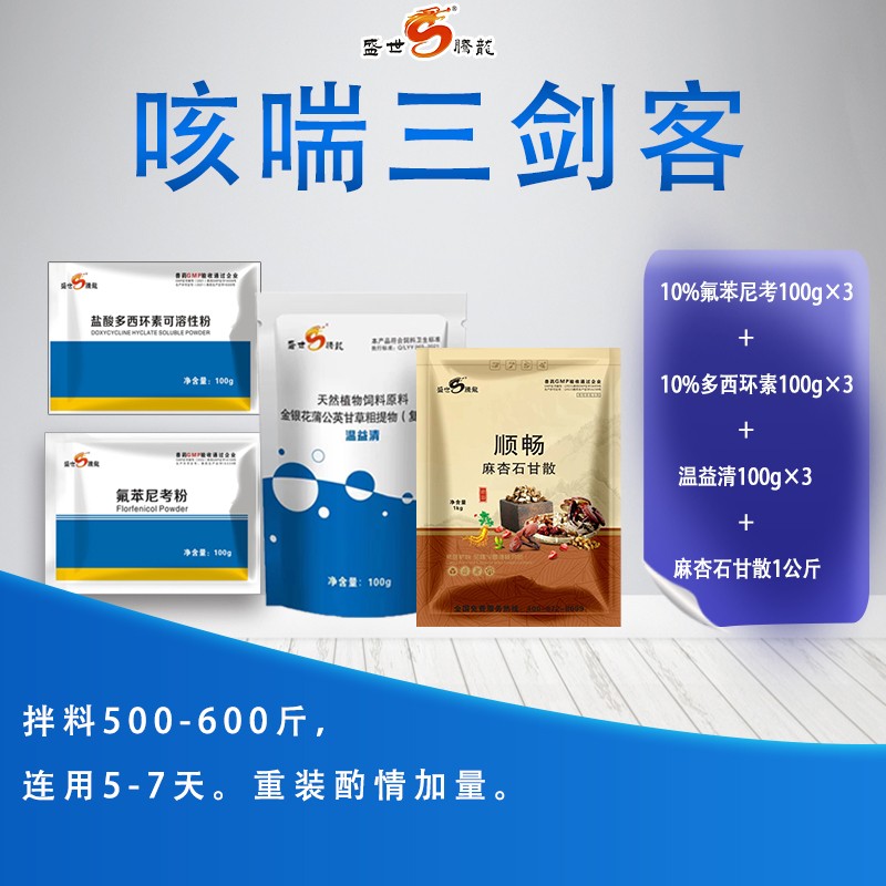 - 商品名称:咳喘三剑客(氟苯尼考3袋+多西环素3袋+温益清3+麻杏石甘散1)猪气喘病咳嗽腹式呼吸各种呼吸道问题
