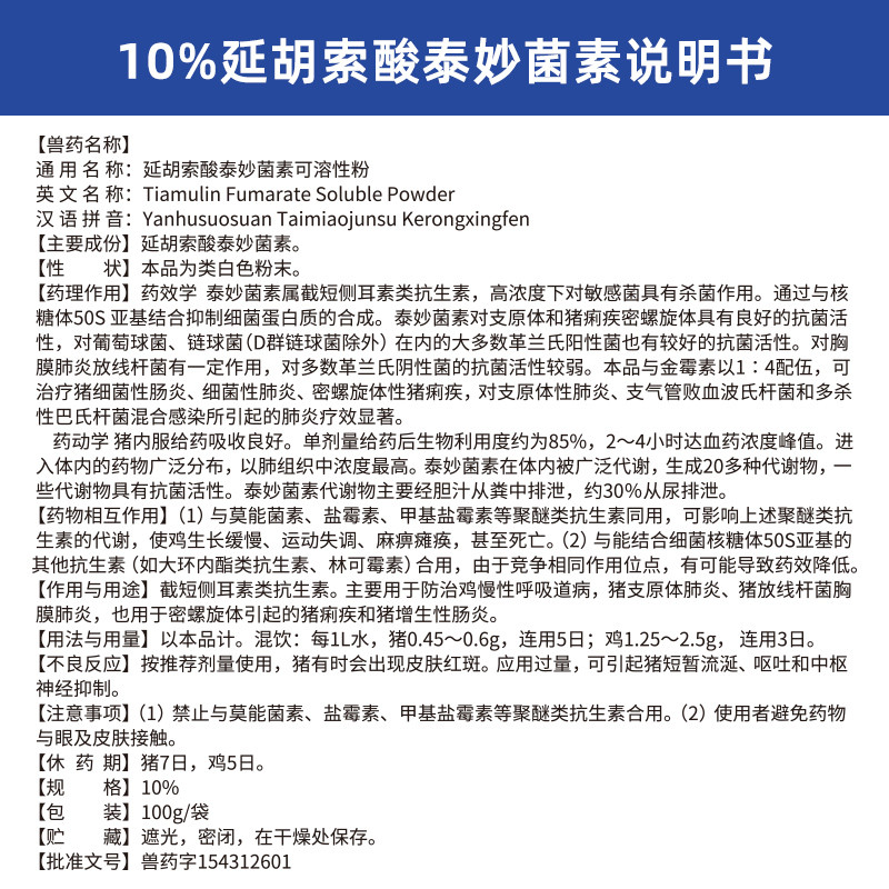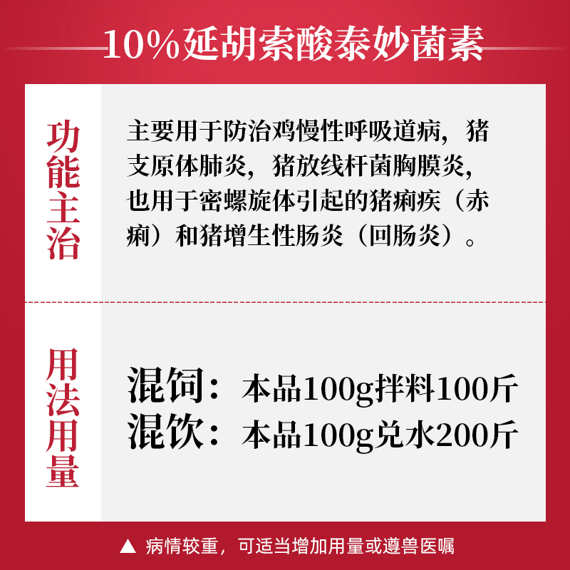 - 商品名称:【吉博士】 10%延胡索酸泰妙菌素可溶性粉100g 支原体肺炎呼吸道肠炎