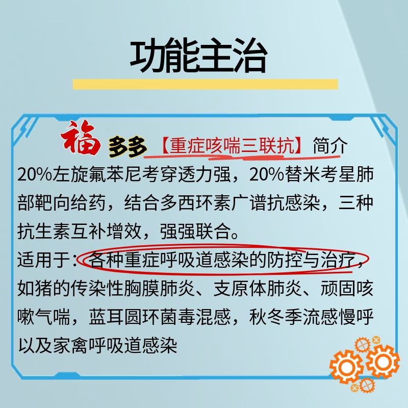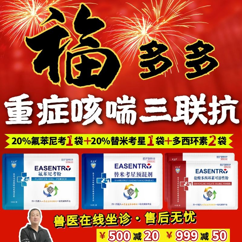 卖家回复 感谢河北秦皇岛袁先生的五星好评,宜生源【福多多】咳喘套装,含20%氟苯尼考粉1袋,多西环素粉2袋,中药麻杏石甘颗粒2袋,具有抗菌消炎,防控气喘,咳嗽的作用,可用于仔猪育肥猪呼吸道感染的治疗,产品使用如有疑问,可及时联系在线兽医师,祝您生活愉快!