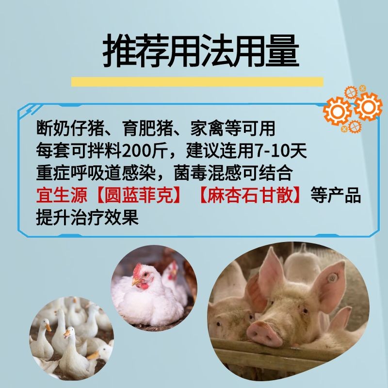 管理员:您好,宜生源福多多咳喘套装,一套可以拌料200斤,或者兑水400斤,建议连用7天,对各种呼吸道感染,咳喘效果很好,您可以放心下单,感谢您的支持!