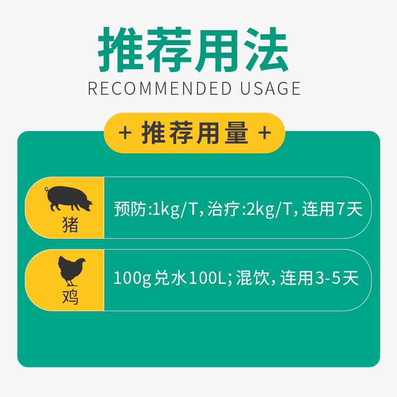 - 使用剂量:100g拌料200斤。饮水剂量减半