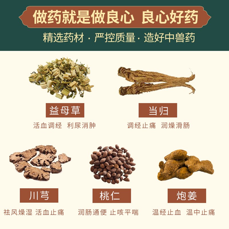 - 主要成分:益母草、当归、川芎、桃仁、炮姜等