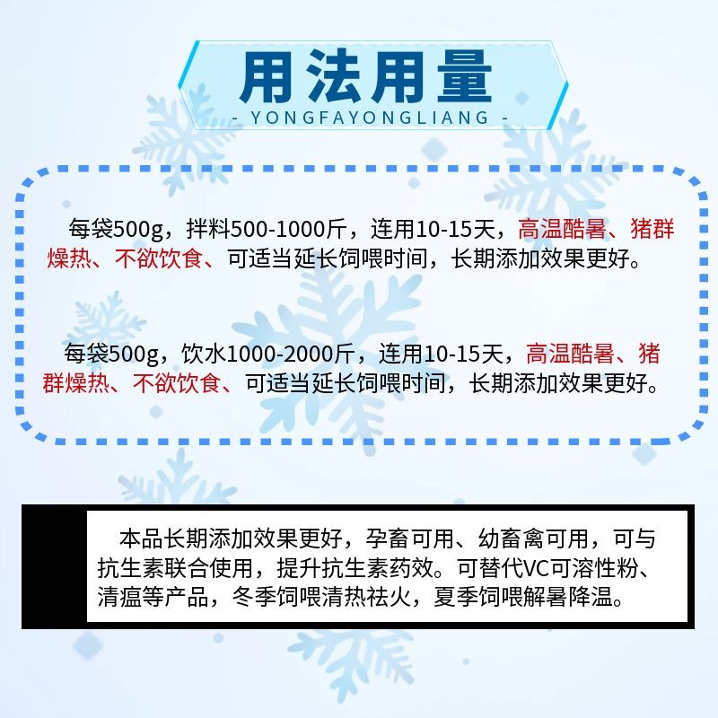 - 使用方法:拌料:每袋拌料500-1000斤,正常饲喂,饮水:每袋兑水1000-2000斤全天饮用