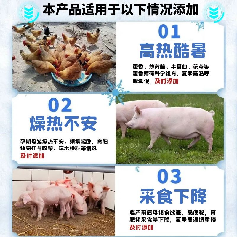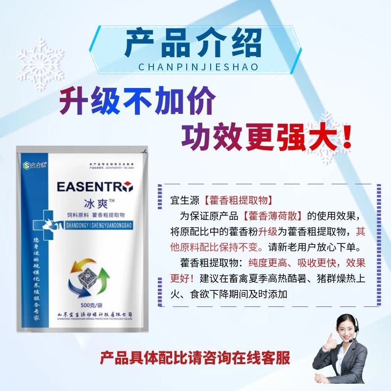管理员:您好,有什么可以帮您的吗?宜生源【冰爽】藿香薄荷散,可饮水,可拌料,针对夏季酷暑高温有很好的降温退热效果,可增强食欲,高温高热季节稳定采食量,中午高热可兑水饮用,起到藿香正气水功效,产品如有咨询,可及时联系在线兽医师,祝您生活愉快!