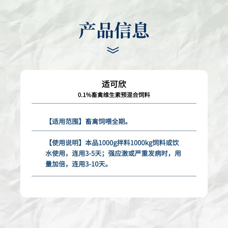 - 商品名称:【小易制药】适可欣0.1%畜禽维生素预混合饲料,提供营养提高免疫力改善亚健康提高生产繁殖性能病后恢复
