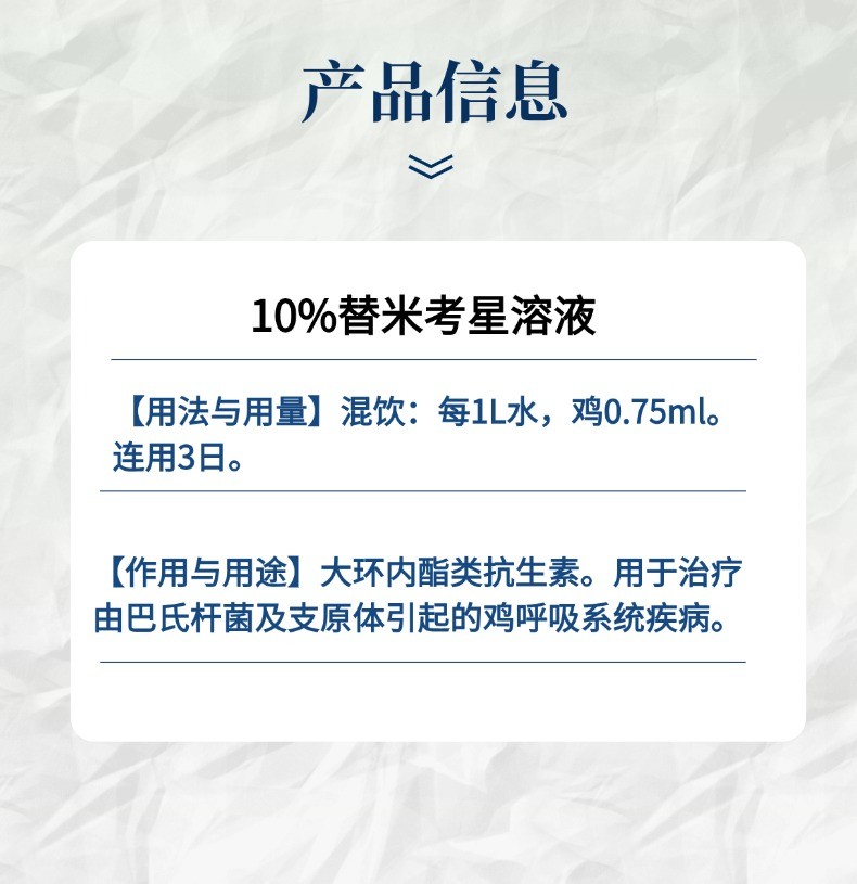 - 商品名称:【小易制药】替行健10%替米考星溶液用于治疗由巴氏杆菌及支原体引起的鸡呼吸系统疾病