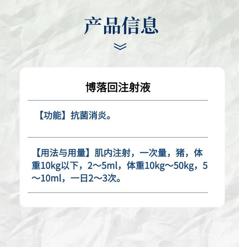 - 使用方法:肌内注射,一次量,猪,体重10kg以下,2~5ml,体重10kg~50kg,5~10ml,一日2~3次。