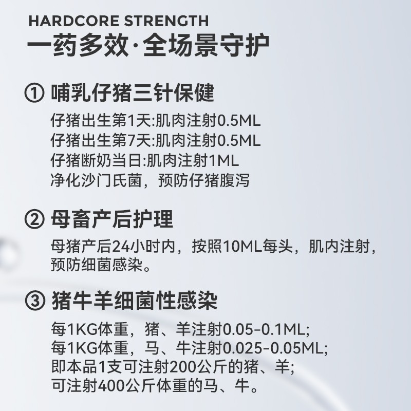 - 使用方法:肌内注射:一次量,每1kg体重,猪0.08-0.12ml,一日1次,连用3-5日。