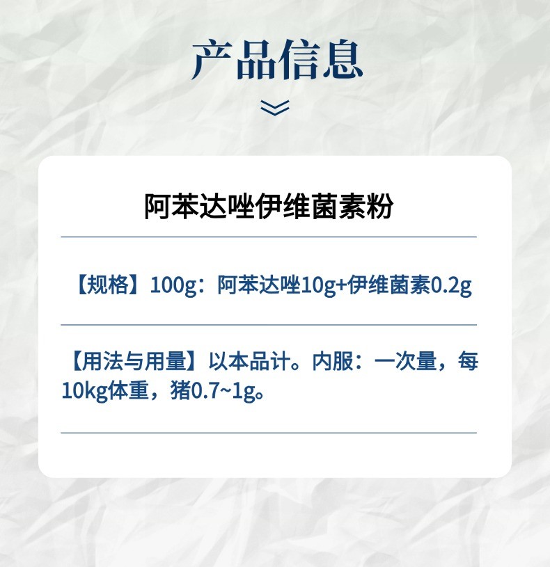 - 主要成分:阿苯达唑、伊维菌素