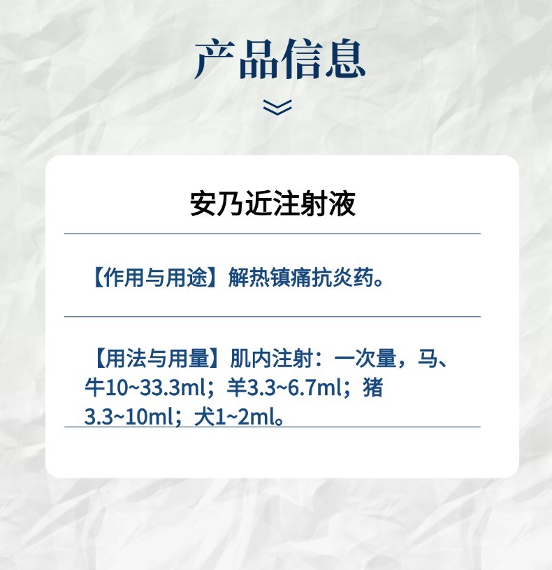- 使用剂量:肌内注射:一次量,马、牛10~33.3ml;羊3.3~6.7ml;猪3.3~10ml;犬1~2ml。