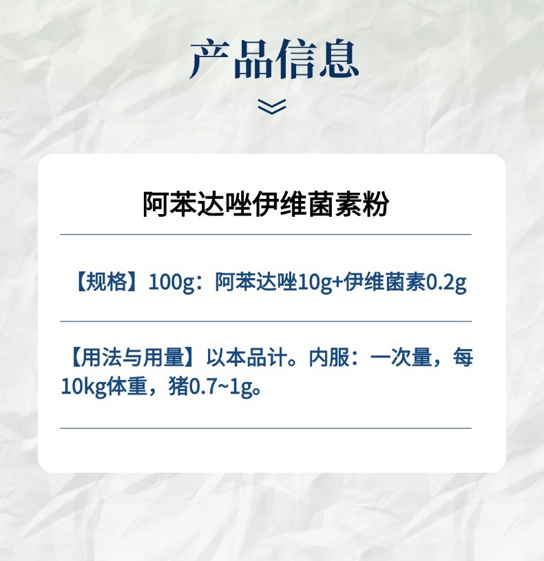 - 主要成分:阿苯达唑、伊维菌素