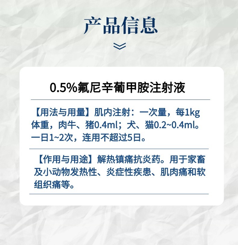 - 商品名称:【小易制药】氟尼辛葡甲胺注射液解热镇痛抗炎针剂用于家畜及小动物发热性、炎症性疾患、肌肉痛和软组织痛等