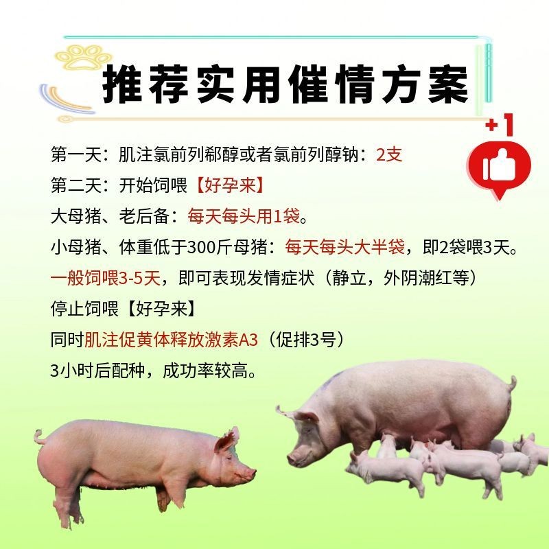 管理员:您好,饲喂好孕来母猪发情了就可以停喂配种了,不建议在继续饲喂了,配种前可肌注促排A3,配种成功率更高,宜生源好孕来,催情促孕,修复子宫,感谢您的关注支持,有什么问题可以及时联系我们。