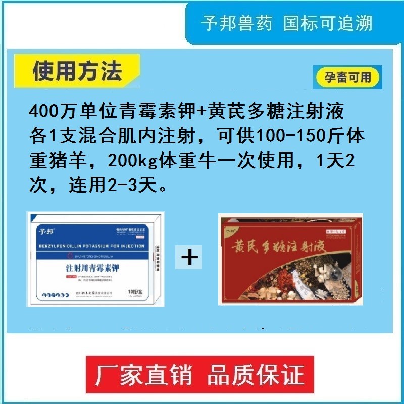 - 商品名称:【予邦】高热病综合征组合(注射用青霉素钾+黄芪多糖注射液)菌毒混合感染 高烧高热 猪牛羊孕畜可用