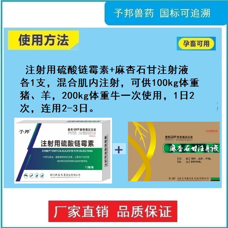- 商品名称:【予邦】猪牛羊咳喘流感组合(注射用硫酸链霉素+麻杏石甘注射液)呼吸道感染 猪牛羊马犬可用