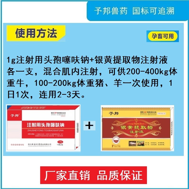 商品名称:【予邦】危重猪牛羊康组合(1g注射用头孢噻呋钠+银黄提取物注射液)-抗菌消炎 清热解毒猪牛羊孕畜可 商品编号:ZHUEJPH4816848 上架时间:2023-06-08 商品净重:600克 主要成分:头孢噻呋钠,银黄 使用方法:混合肌内注射 生产厂家:四川积善之家药业有限公司 使用剂量:详见使用说明