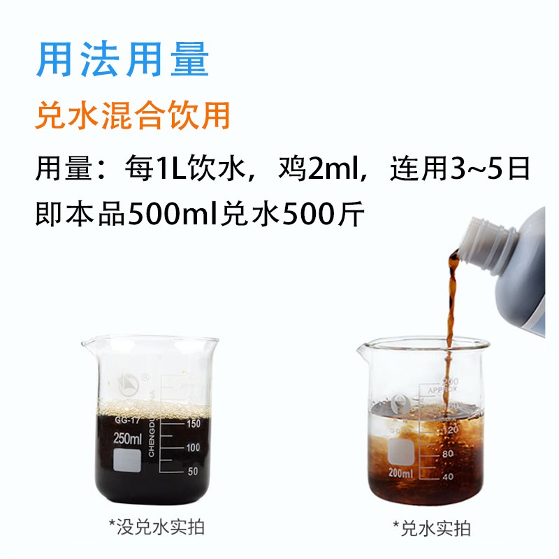 - 使用方法:每1L饮水,鸡2ml,连用3~5日