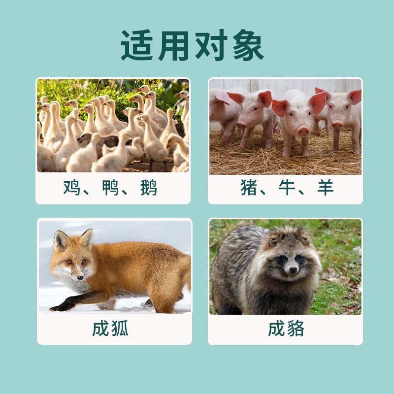 - 使用方法:禽畜:本品500g可拌料500kg,混饮1000L 毛皮动物:本品500g可用于2000只成狐、成骆;或用于4000只成骆。