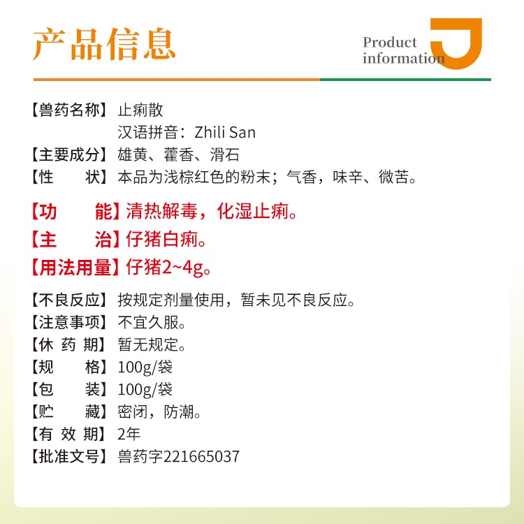 商品名称:【猪大夫】止痢散100g/袋 拉稀腹泻仔猪黄白痢 过奶止痢 母仔同治 清热解毒化湿 商品编号:ZHUEJPH0009517250 品牌:鼎尖 上架时间:2023-09-01 商品净重:100克 产品批文号:兽药字221665037
