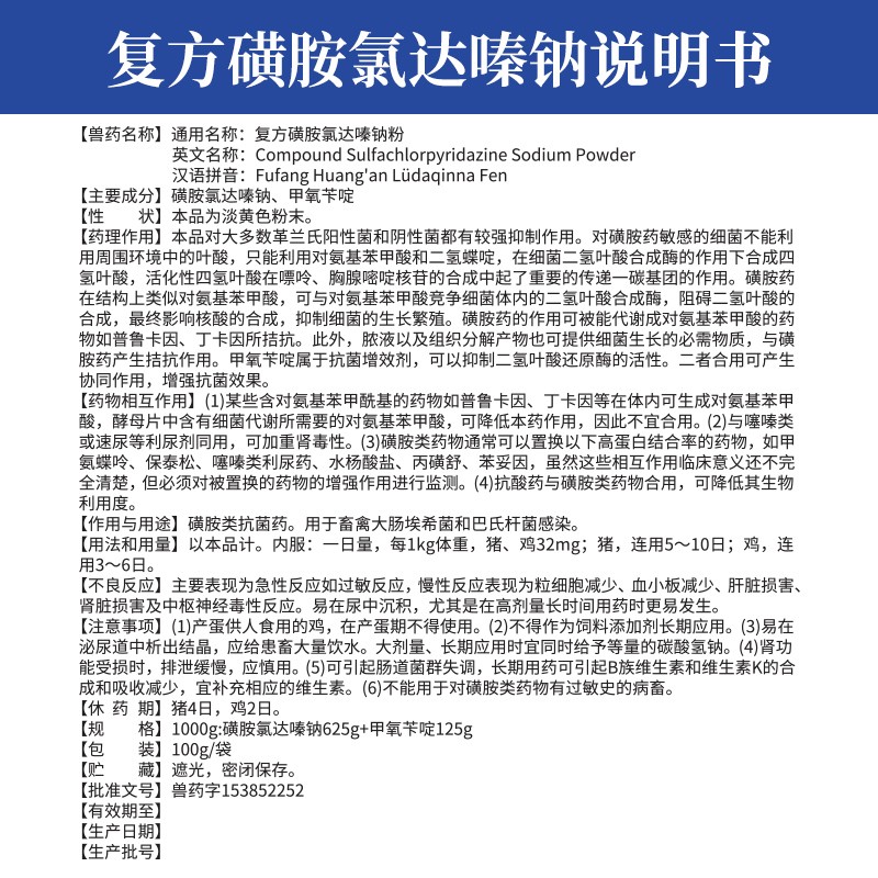 - 主要成分:磺胺氯哒嗪钠、甲氧苄啶