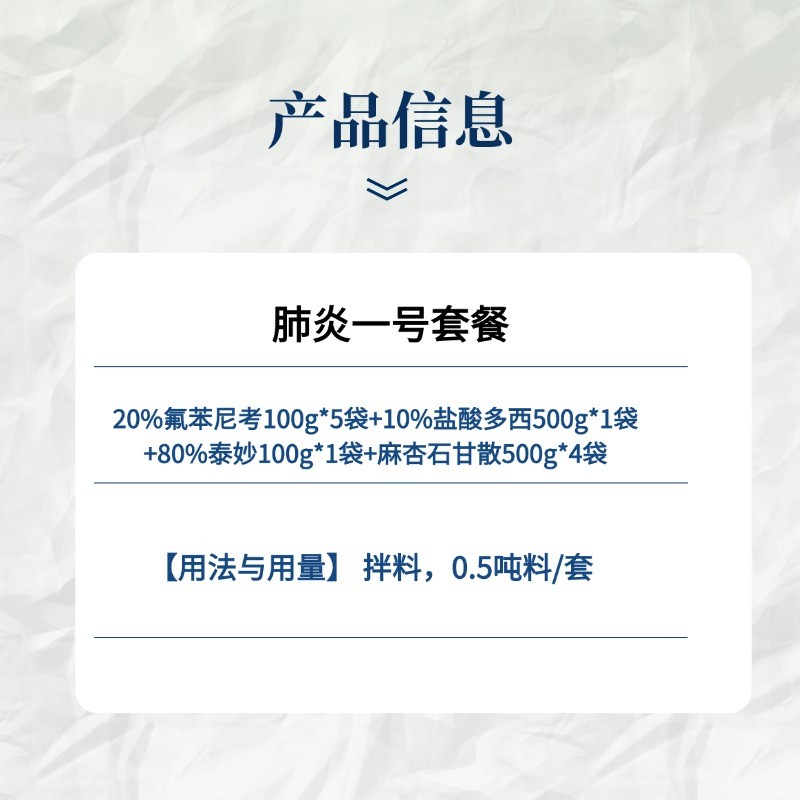 商品名称:【小易制药】咳喘无忧千斤包肺炎套餐猪支原体胸膜肺炎咳喘治疗组合 商品编号:xyzy00060 品牌:潍坊牧易生物科技有限公司 上架时间:2023-10-31 商品净重:3.100千克 保质期:24个月 生产厂家:潍坊牧易生物科技有限公司 使用剂量:本套餐用于1000斤料 产品批文号:兽药字152995174