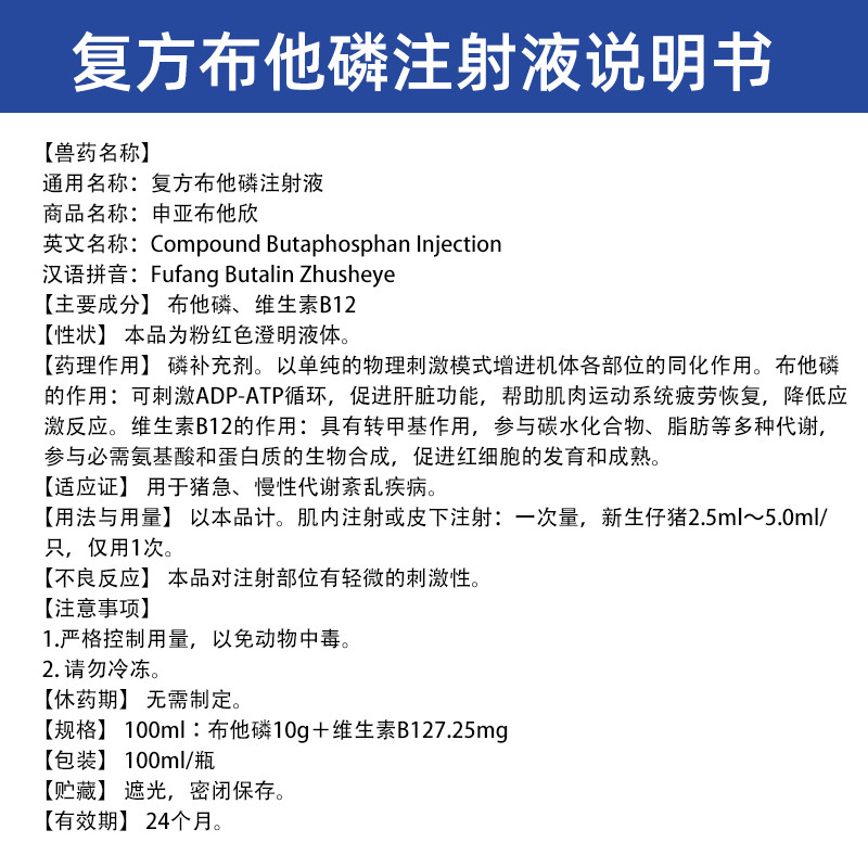 - 商品名称:【吉博士】复方布他磷注射液 仔猪代谢紊乱降低应激疲劳