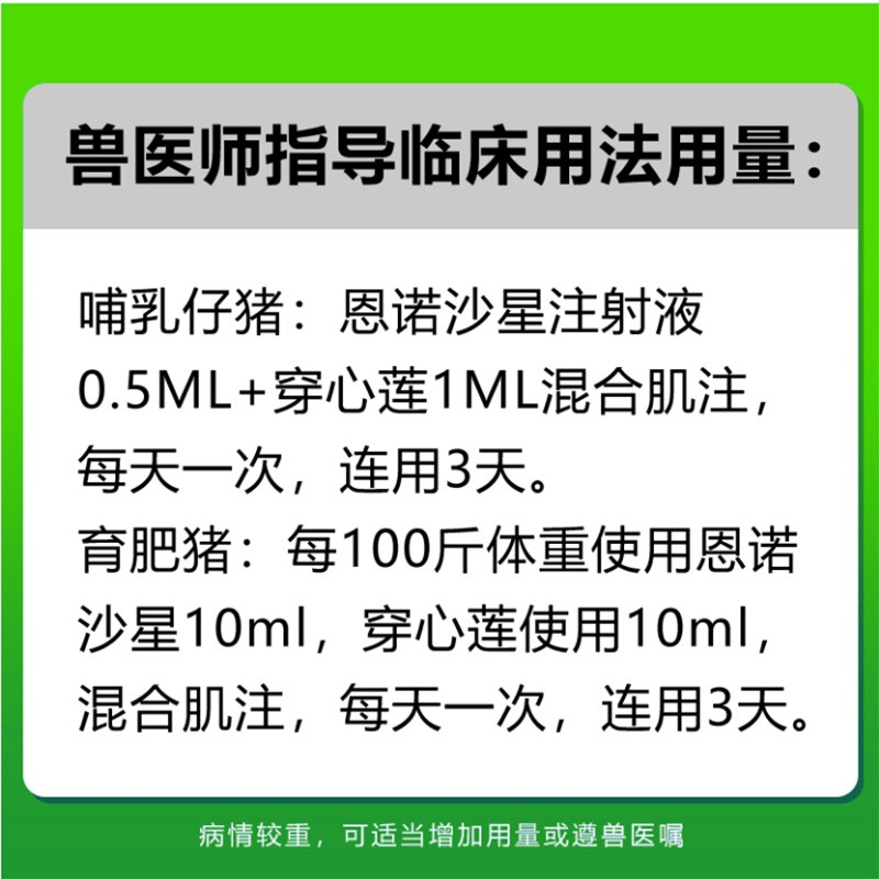 商品名称:【会德】顽固腹泻套装穿心莲恩诺沙星断奶仔猪肠炎呼吸道感染母猪保健病毒性腹泻拉稀腹泻止痢黄白痢止泻 商品编号:ZHUEJPH0008817980 品牌:红富态 上架时间:2024-07-16 商品净重:200克 产品批文号:兽药字031971295