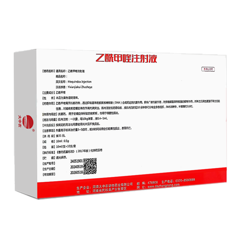 商品名称:【开扬】 乙酰甲喹注射液10mlx10支/盒兽用 商品编号:ZHUEJPH0003518040 品牌:开扬 上架时间:2024-08-10 商品净重:1.000千克 是否包被:否 产品批文号:兽药字162084645