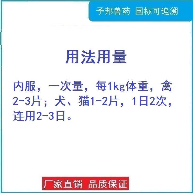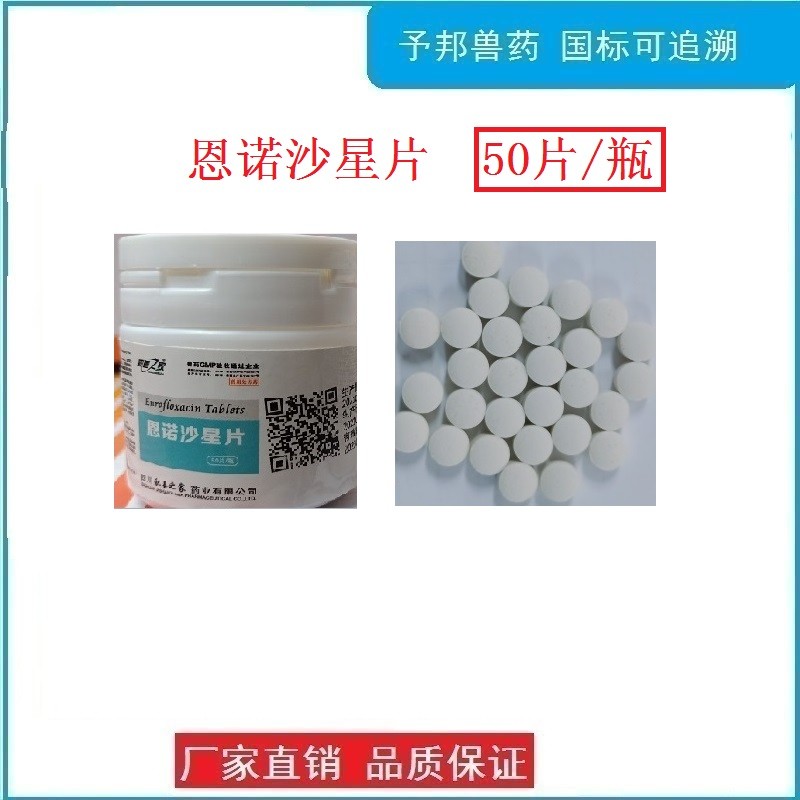 商品名称:【予邦】恩诺沙星片50片/瓶 兽用兽药 国标可追溯 喹诺酮类抗生素 细菌感染 支原体感染 抗生素 商品编号:ZHUEJPH0003118081 品牌:予邦兽药 上架时间:2024-08-22 商品净重:50克 整件规格:245瓶/件 产品批文号:兽药字221291292