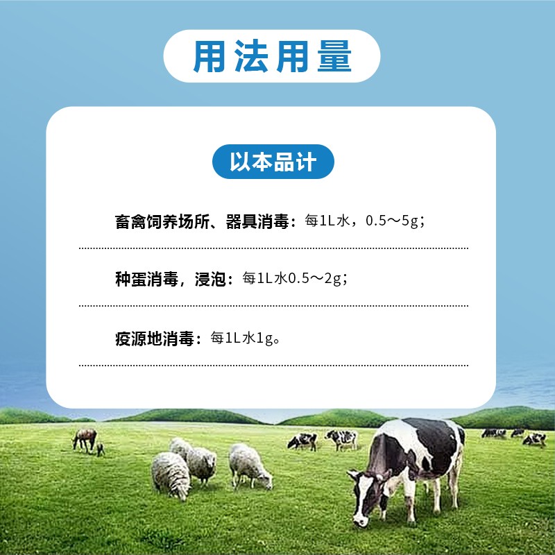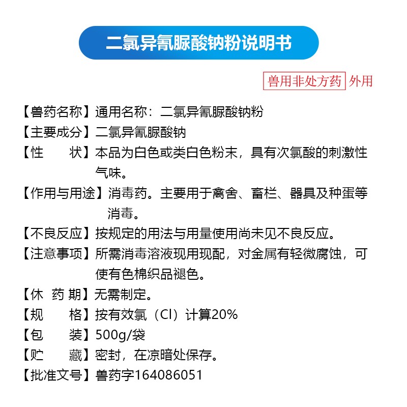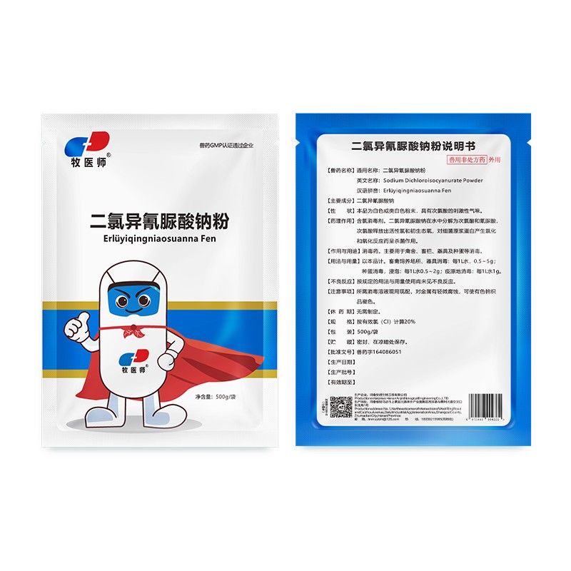 商品名称:【牧医师】二氯异氰脲酸钠粉兽用消毒剂猪用牛羊鸡鸭鹅圈舍杀菌除菌专用 商品编号:ZHUEJPH0003618142 品牌:牧医师 上架时间:2024-10-16 商品净重:500克 产品批文号:兽药字164086051