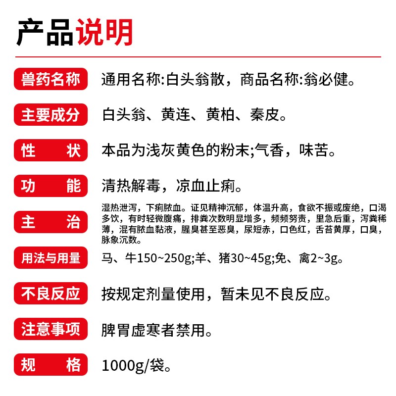 商品名称:【开扬】白头翁散1000g兽用 商品编号:ZHUEJPH0005118169 品牌:开扬 上架时间:2024-10-22 商品净重:1.000千克 产品批文号:兽药字162085053
