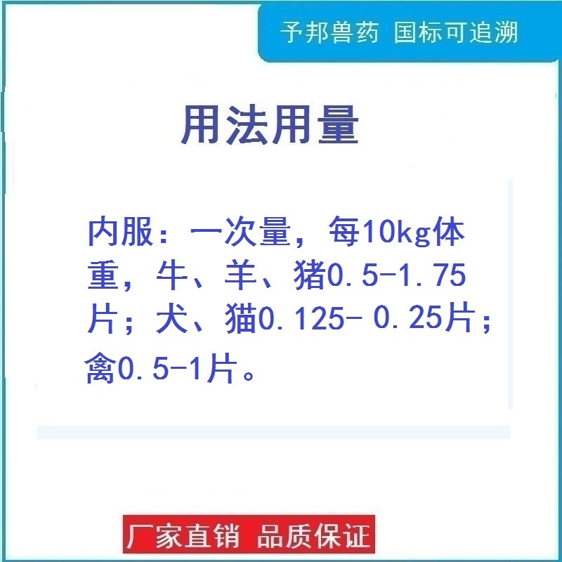 - 使用方法:内服,每10公斤体重猪牛羊1.5片,犬猫0.25片,禽1片