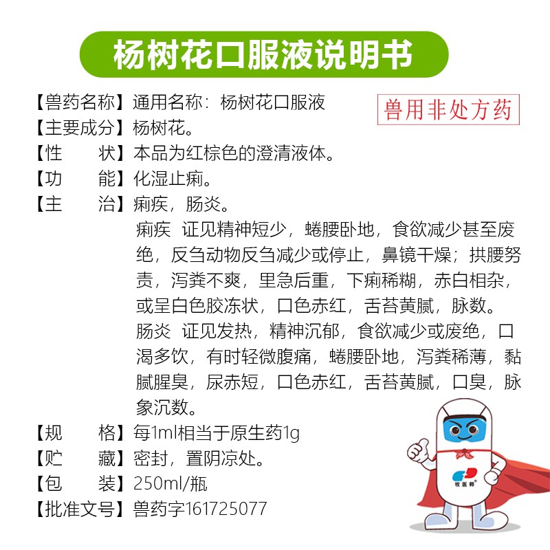 商品名称:杨树花口服液拉稀止痢仔猪犊牛羔羊兔子拉稀通用 商品编号:ZHUEJPH000818302 品牌:牧医师 上架时间:2025-01-11 商品净重:250克 产品批文号:兽药字161725077