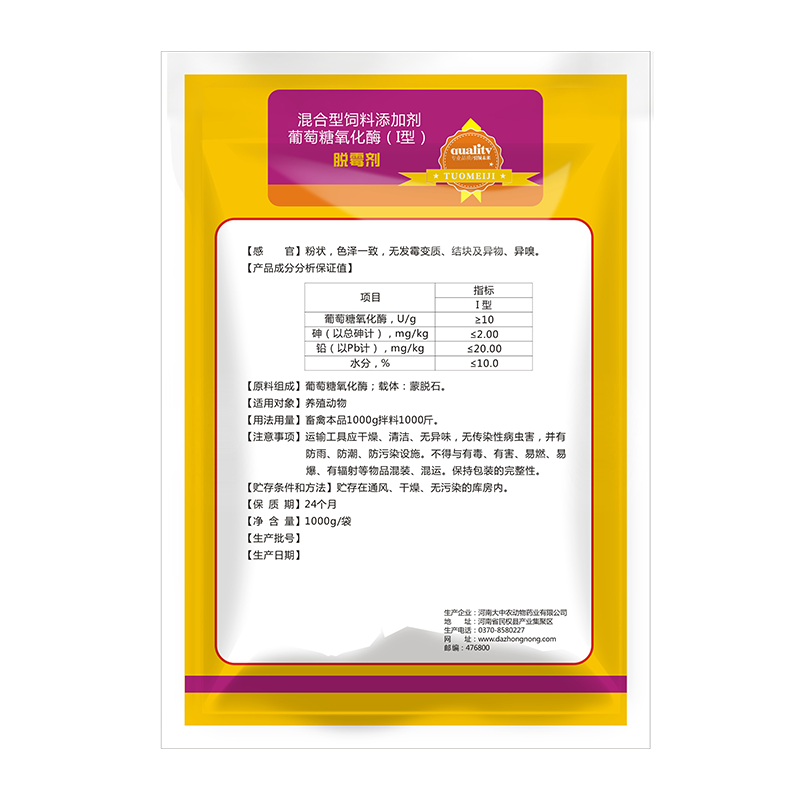 商品名称:【开扬】脱霉剂1Kg/包葡萄糖氧化酶养殖生物脱霉剂脱霉不吸附营养 商品编号:ZHUEJPH0001918307 品牌:开扬 上架时间:2025-01-20 商品净重:1.000千克 质保期:24ge月 产品批文号:Q/HDZN 013-2023