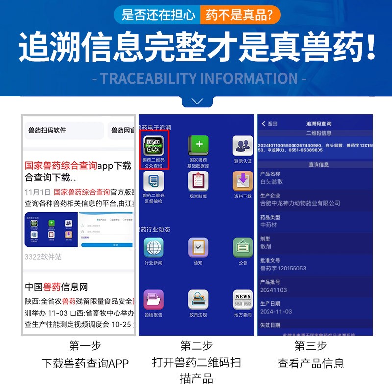 商品名称:【中龙神力】白头翁散 500g 兽药兽用止痢散大肠杆菌猪鸡用拉稀止痢黄白痢中药 商品编号:fs014 品牌:中龙神力 上架时间:2025-03-13 商品净重:500克 产品批文号:兽药字120155053