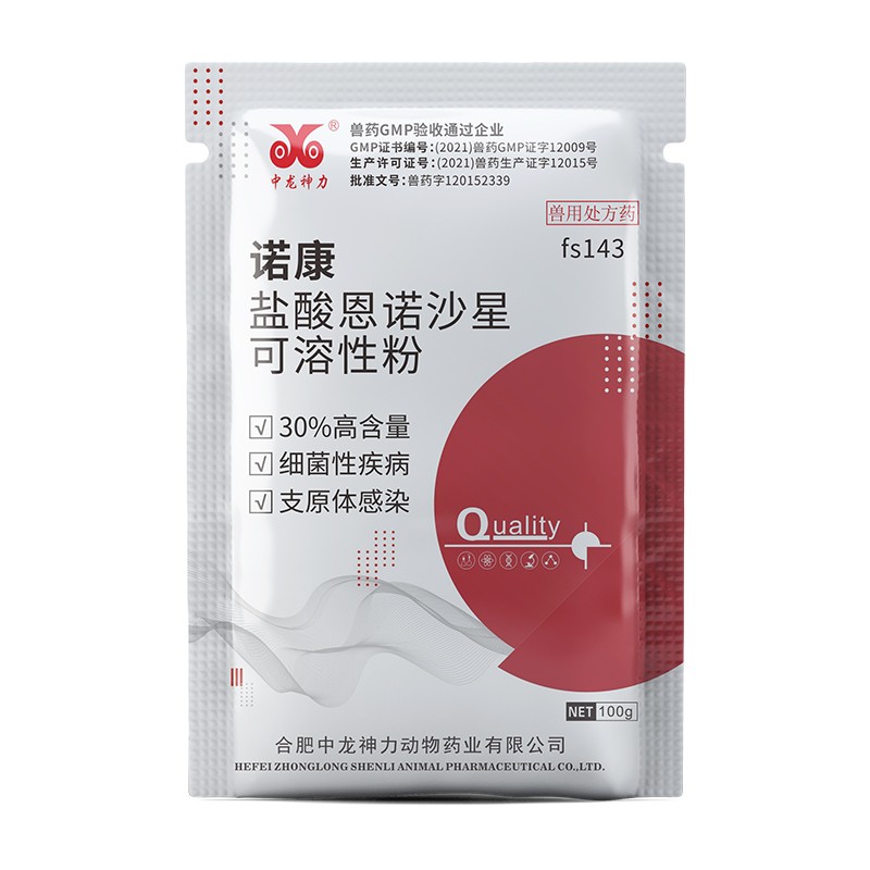 商品名称:【中龙神力】30%盐酸恩诺沙星可溶性粉鸡药鸭小鹅拉稀家禽呼吸道正品兽药 商品编号:fs143 品牌:中龙神力 上架时间:2025-03-17 商品净重:100克 产品批文号:兽药字120152339