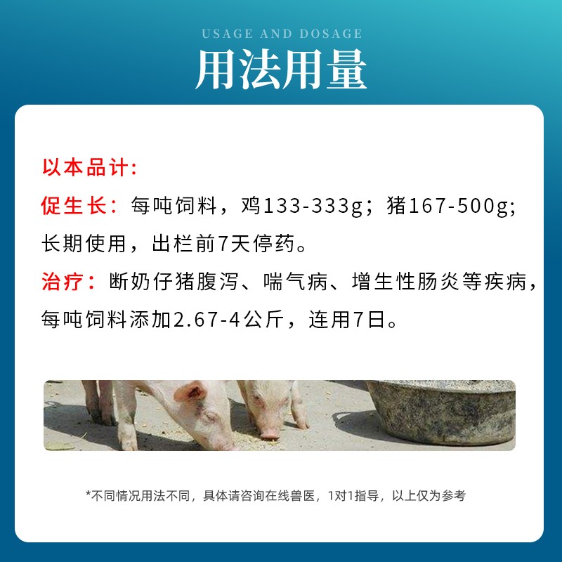 管理员:主要作用为①提高采食量 ②降低料肉比 催肥 ③预防咳嗽 腹泻 用量:1吨料添加本品3kg。