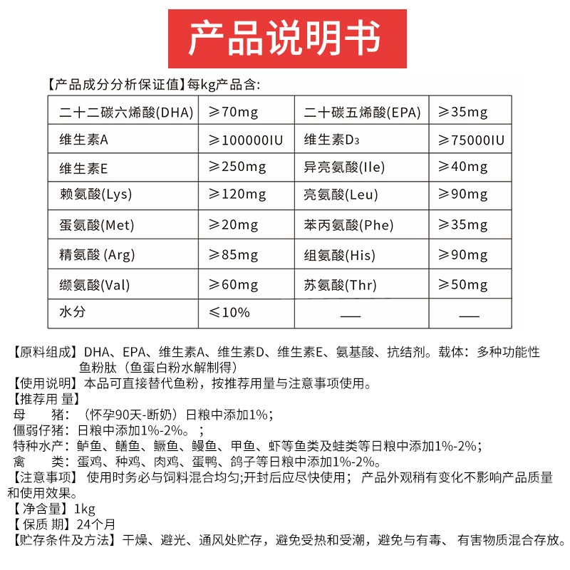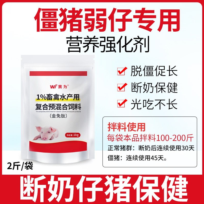 商品名称:【赛为】僵猪弱仔脱僵促长营养强化剂多维氨基酸断奶仔猪保健添加剂金免肽 商品编号:ZHUEJPH0006718475 品牌:赛为 上架时间:2025-03-26 商品净重:1.000千克 使用方法:每袋拌料100-200斤