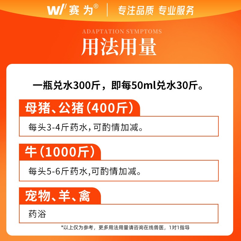 - 使用方法:每50毫升兑水30斤,动物全身喷洒淋湿药浴,或环境喷洒