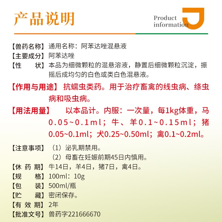 商品名称:【猪大夫】500ml阿苯达唑混悬液 兽用 畜禽线虫绦虫吸虫抗寄生虫 商品编号:ZHUEJPH0003018514 品牌:猪大夫 上架时间:2025-05-06 商品净重:500克 产品批文号:兽药字221666670