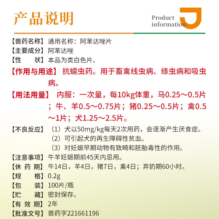 商品名称:【猪大夫】100片阿苯达唑片 兽用 畜禽蠕虫绦虫线虫吸虫内外同驱 商品编号:ZHUEJPH000818515 品牌:猪大夫 上架时间:2025-05-06 商品净重:500克 产品批文号:兽药字221666042