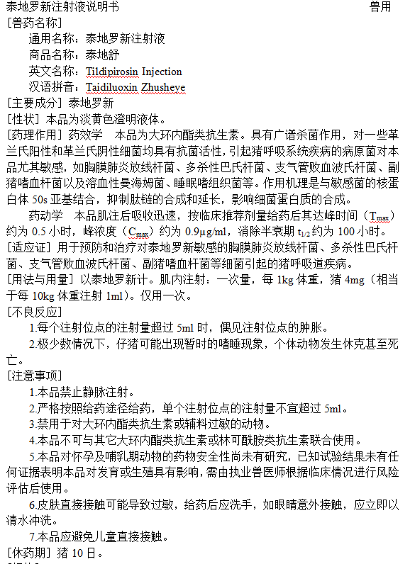 [适应证] 用于预防和治疗对泰地罗新敏感的胸膜肺炎放线杆菌、多杀性巴氏杆菌、支气管败血波氏杆菌、副猪嗜血杆菌等细菌引起的猪呼吸道疾病。