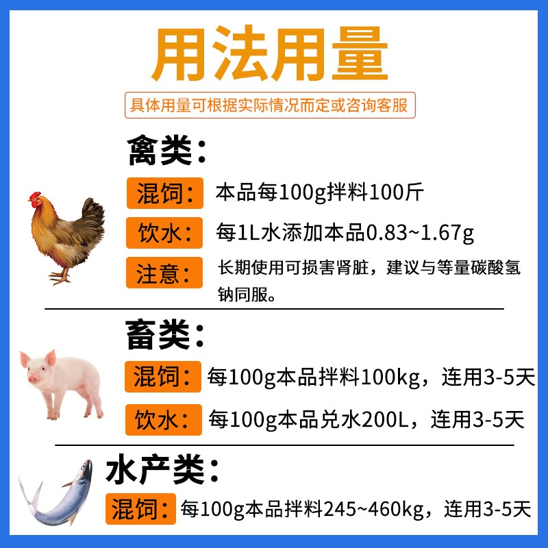 - 使用方法:以本品计。混饮:每1L水,鸡0.83~1.67g。连用 3~5 日。